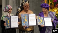 В этом году разделили между собой три женщины. Лауреатами премии стали президент Либерии Элен Джонсон-Серлин, либерийская правозащитница Лейма Гбови и активистка из Йемена Таваккул Карман.
