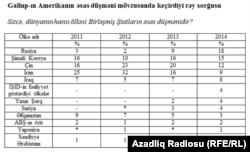 Rusiya “Amerikanın düşmənləri” siyahısında "liderliyi" ələ keçirdiyindən, əvvəlki illərdə siyahının başında durmuş ölkələr (2014-cü ildə Çin, 2011-ci və 2012-ci illərdə İran) bu il geriləyiblər. Başlıca düşmən kimi Çinin adını çəkənlər bir il ərzində 8% azalaraq 12%-ə düşüb. İranı əsas düşmən kimi görənlər də 7% azalıb və hazırda 9%-dir.