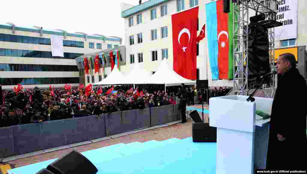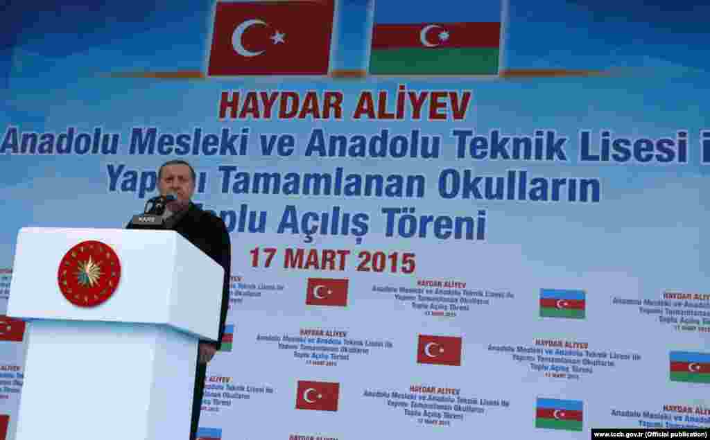 R.T. Erdogan çıxış edərək Azərbaycan ilə Türkiyə arasında münasibətlərdən danışıb. O bildirib ki, təhsil mərkəzini şəhərdə tikilməsində əməyi keçənlərə minnətdardır. ​