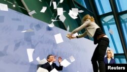 Avropanın pullarını idarə edən şəxsi yəqin ki, bu hadisəni uzun müddət unutmayacaq. Söhbət Avropa Mərkəzi Bankının (ECB) rəhbəri Mario Draghi-nin Frankfurtda keçirilən mətbuat konfransında baş verən qəribə hadisədən gedir. Bankir zala toplaşan jurnalistlərdən hər cürə sual gözləyirdi, lakin bunu... Bir qadın gözlənilmədən masaya çıxaraq, kağızları onun başına səpələməyə başlayıb. Təhlükəsizlik xidmətinin əməkdaşları onu zaldan çıxarıblar.