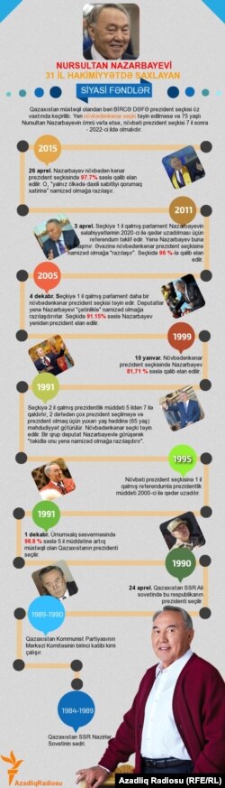 Müstəqillik əldə edəndən bəri Qazaxstanda 5 dəfə prezident seçkiləri olub və hər birində də Nazarbayev qalib gəlib. Bu seçkiləri beynəlxalq müşahidəçilər azad və ədalətli hesab etməyib.