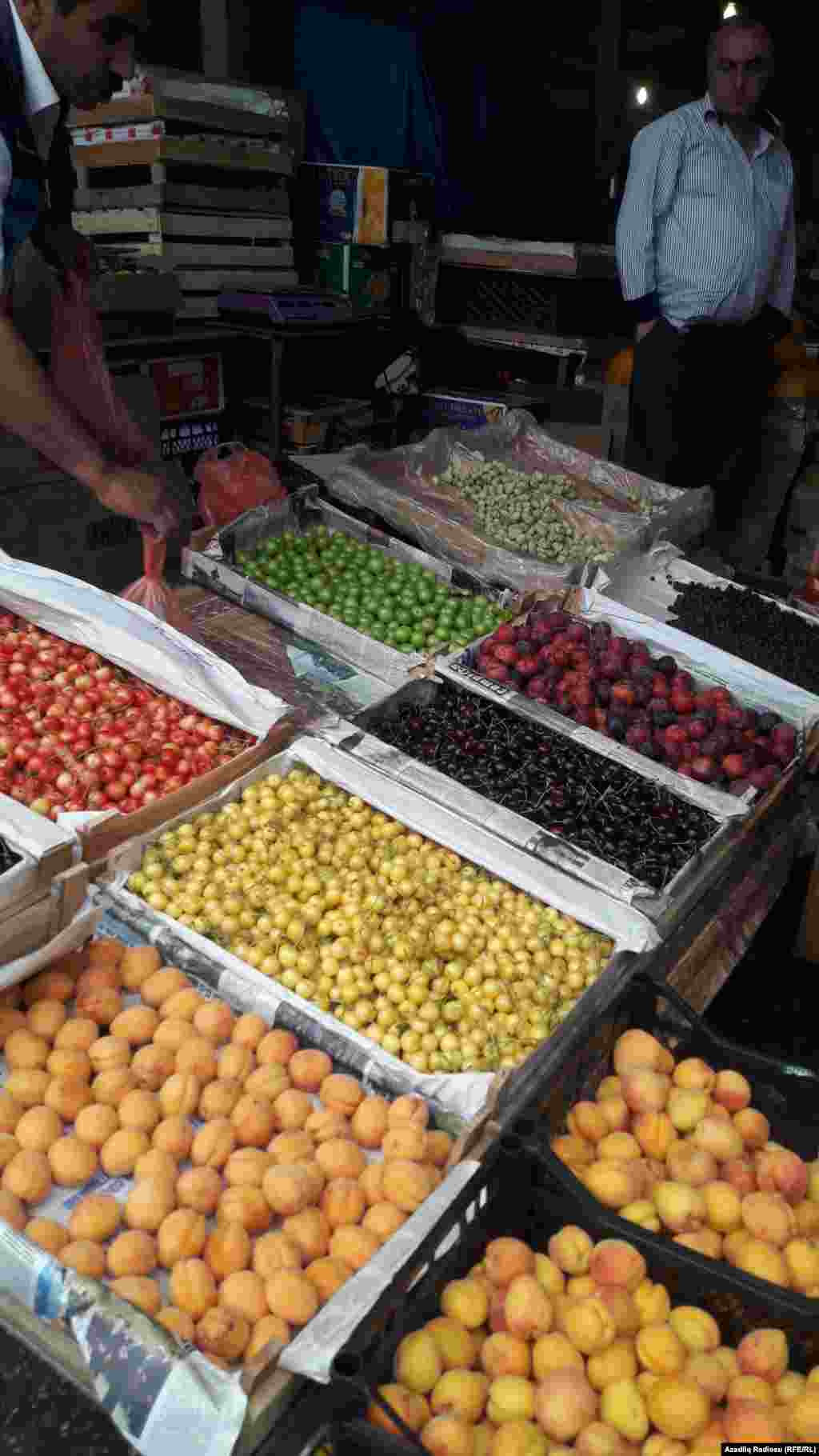 Ərik, armud, gilas, şaftalı, alça... Bazarda hər çeşiddə, hər bölgədən və hər qiymətdə mal var. Elə mövsümün meyvəsi gilasın qiyməti 2 manat yarımdan başlayıb 5-6 manatda bitir. Xaçmazdan, Qusardan paytaxt Bakıya gətirilən öküzürəyi, ağ gilas, ala gilas “gəl-gəl” deyir, amma qiyməti müştərini yanında çox saxlaya bilmir.
