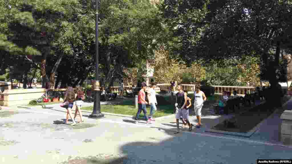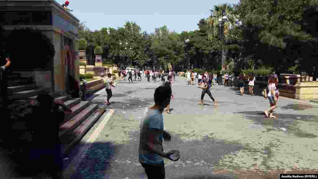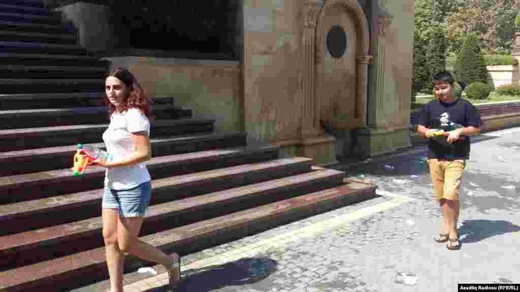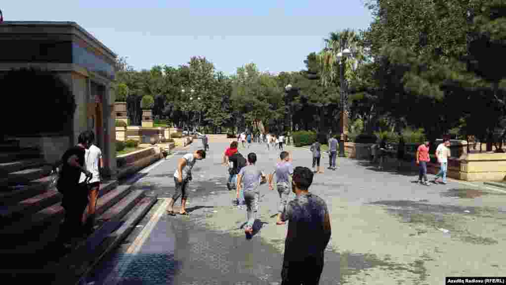 Avqustun istisində Bakıda gənclər sərinləməyin yolunu tapıblar. Bir-birlərinə su atırlar.