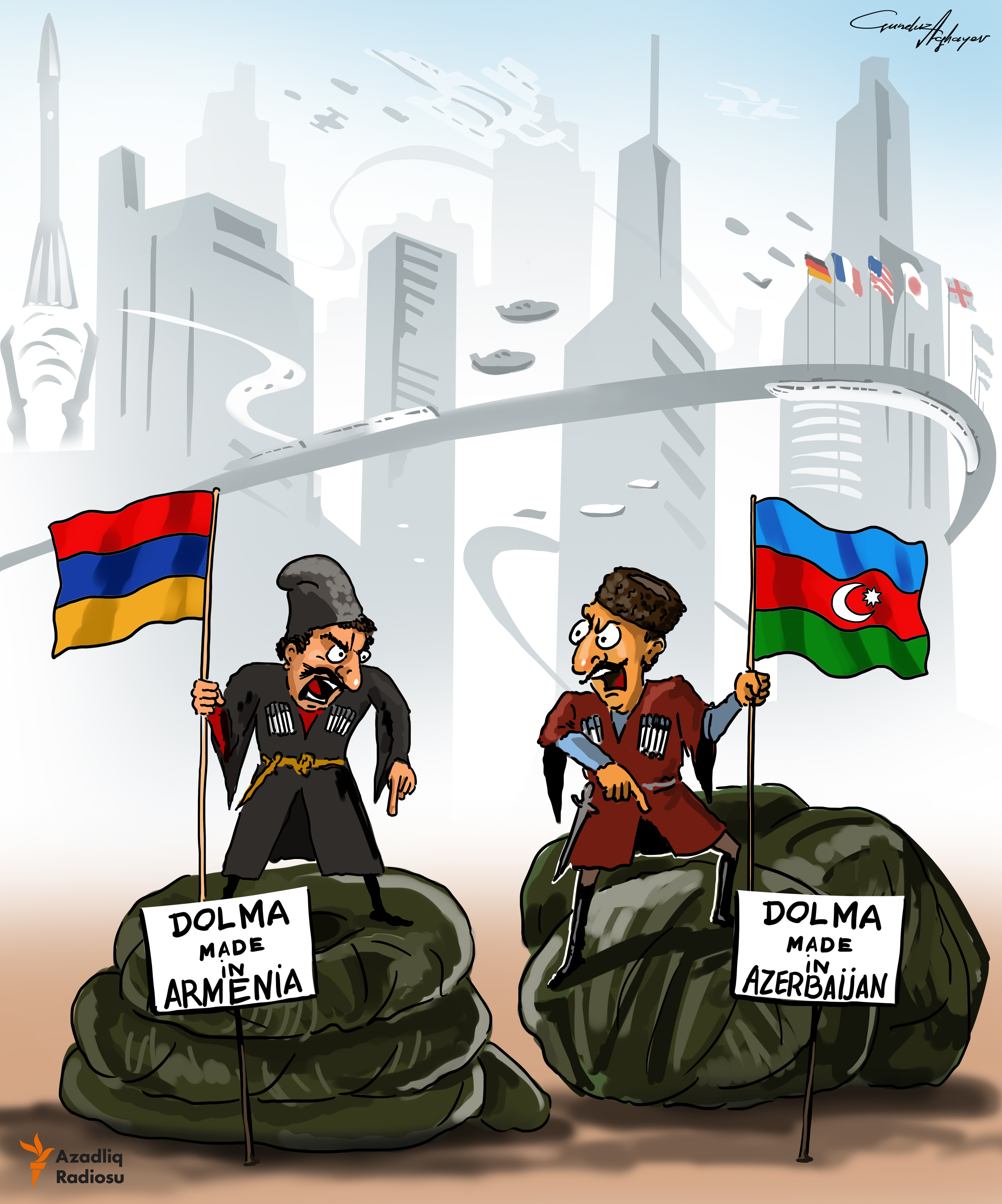 Azərbycanla Ermənistanın dolma mübahisəsi heç də ərazi çəkişməsindən geri qalmır. Bəzən beynəlxalq təşkilatlar yanında da açıq polemikalara səbəb olan dolma mübahisəsi bugünlər daha da qızışıb. Mayın axırlarında Ermənistanda keçirilən festivalda 70-ə qədər dolma növü nümayiş etdirilmişdi. İyulun 1-də Bakıda keçirilən eyni məzmunlu festivala isə 300 növ dolma çıxarılması planlaşdırılır. Dolma mübahisəsini bir də Gündüz Ağayevin karikaturasında izləyək.