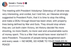 Zelenski isə "Ukrayna sülh istəyir, Rusiya isə yox" deyib və bildirib ki, ilk növbədə Ukraynada atəşkəs haqqında razılığa gəlmək lazımdır. Bundan əvvəl ABŞ lideri bunu sülh danışıqları üçün vacib şərt hesab etmədiyini demişdi.